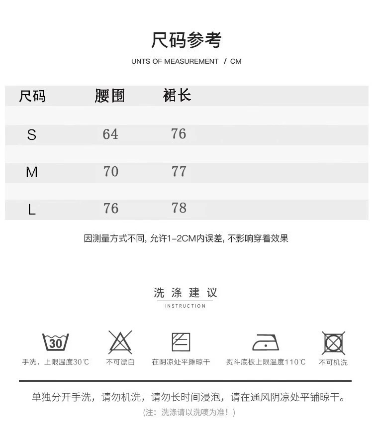 尺寸表会因布料弹性、水洗处理、测量起讫点等因素,与实际商品尺寸略有误差,误差尺寸